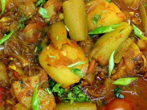Boiled potatoes , simmered in a light, flavorful gravy made with onion, cashew, and magaj (melon seeds) ? mildly spiced and perfect with puri or steamed rice.